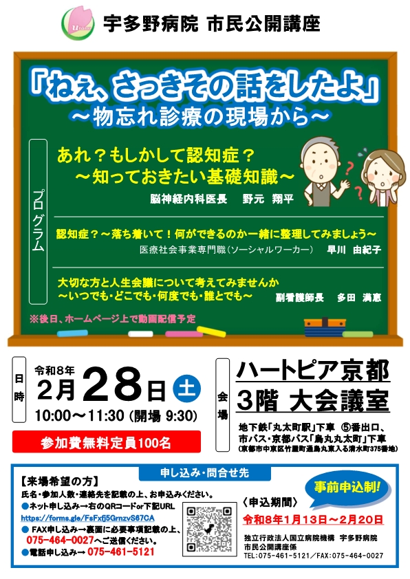 郵送先:〒616-8255 京都市右京区鳴滝音戸山町8 宇多野病院 公開講座係